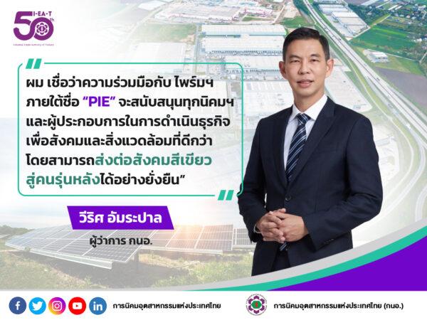 นายวีริศ อัมระปาล ผู้ว่าการการนิคมอุตสาหกรรมแห่งประเทศไทย (กนอ.) เปิดเผยภายหลังเป็นประธานกล่าวเปิดงานสัมมนาเชิงปฏิบัติการ “การสร้างเครือข่ายความร่วมมือด้านพลังงานเพื่อลดการปล่อยก๊าซเรือนกระจกในนิคมอุตสาหกรรม” พร้อมเปิดตัว “บริษัท ไพร์ม อินดัสเทรียล เอ็นเนอร์ยี่ จำกัด” หรือ PIE ว่า กนอ.เป็นอีกหนึ่งหน่วยงานที่ร่วมขับเคลื่อนการพัฒนาประเทศด้วยโมเดลเศรษฐกิจ BCG มุ่งสร้างความสมดุลให้เศรษฐกิจสามารถเติบโตควบคู่กับสิ่งแวดล้อมได้อย่างยั่งยืน โดย กนอ.และ บริษัท ไพร์ม โรด เพาเวอร์ จํากัด (มหาชน) ร่วมทุนจัดตั้ง บริษัท ไพร์ม อินดัสเทรียล เอ็นเนอร์ยี่ จํากัด หรือ PIE ขึ้น เพื่อส่งเสริมผู้ประกอบการทั้งภาครัฐและเอกชน ในการลดการปล่อยก๊าซเรือนกระจกทั้งในเขตนิคมอุตสาหกรรม และนอกเขตนิคมอุตสาหกรรม