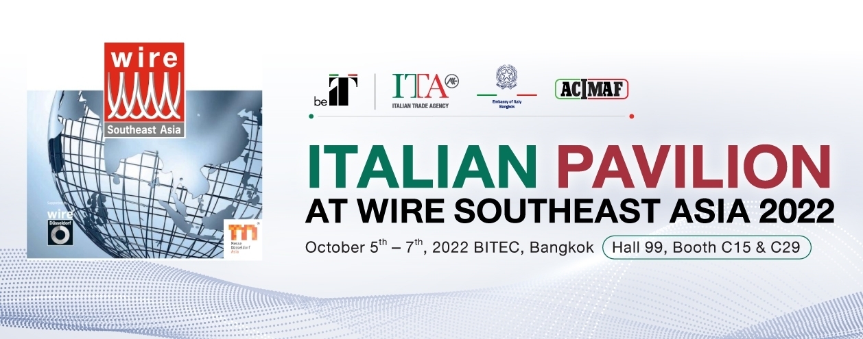 พรุ่งนี้ ! พบกับบูธ ITALIAN PAVILION ได้ที่งานแสดงสินค้าและเทคโนโลยีสำหรับอุตสาหกรรมโลหะแห่งเอเชียตะวันออกเฉียงใต้ ( WIRE SOUTHEAST ASIA 2022 ) ที่ HALL 99 , Booth C15 & C29 ณ ศูนย์นิทรรศการและการประชุมไบเทค (BITEC Bangna) กรุงเทพฯ วันที่ 5 – 7 ตุลาคม 2565