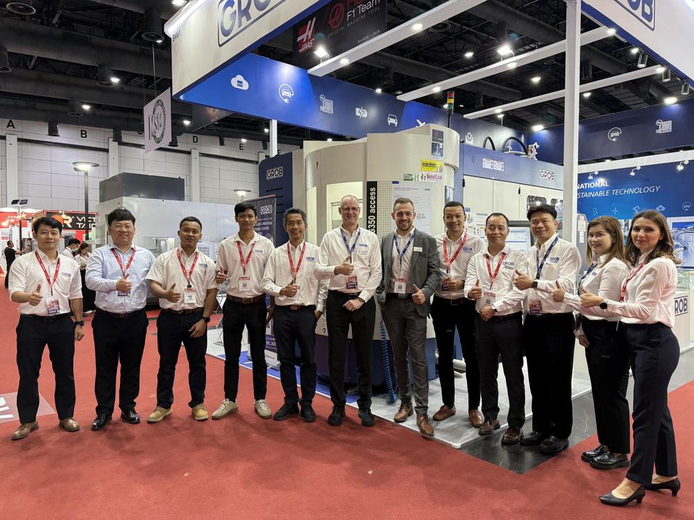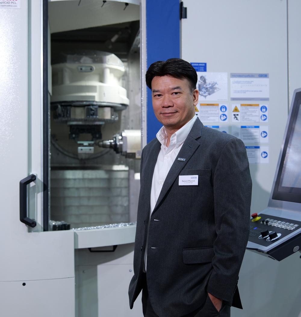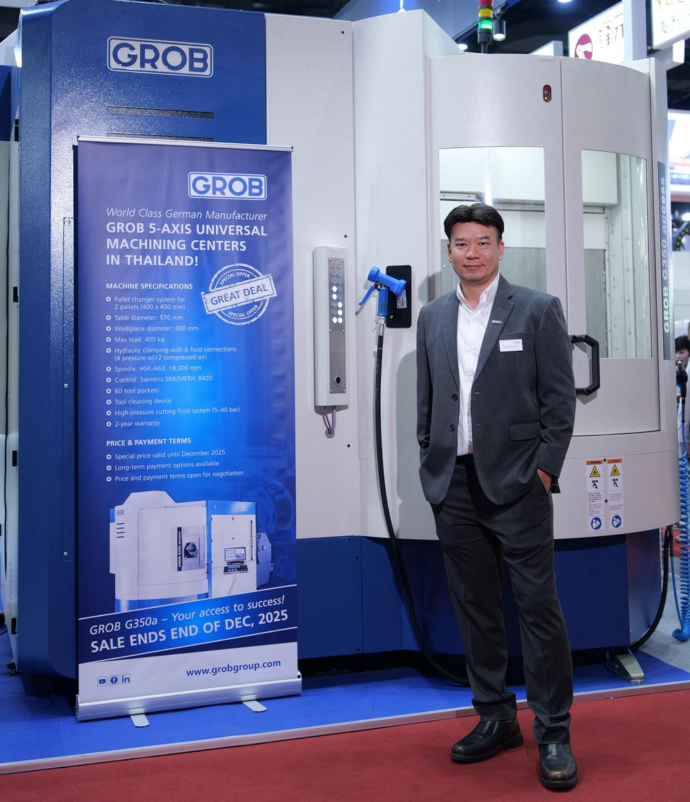นิตยสาร “แมนูแฟคเจอริ่ง รีวิว” ได้มีโอกาสพูดคุยกับคุณสานนท์ พานิช Country Manager, GROB Machine Tools (Thailand) Co., Ltd. กล่าวว่า GROB เป็นบริษัทสัญชาติเยอรมัน และมีโรงงานการผลิตอยู่ 6 แห่ง ทั่วโลก คือ เยอรมัน อเมริกา อิตาลี บราซิล อินเดีย และจีน อีกทั้งมีสำนักงานขายกระจายอยู่ 16 แห่ง ทั่วโลก ในปี 2569 GROB จะมีอายุครบ 100 ปี โดยมีธุรกิจหลักคือเป็นผู้ผลิตเครื่องจักรและระบบออโตเมชันในอุตสาหกรรมการผลิต ซึ่งมีการพัฒนามาอย่างต่อเนื่องและมีเครื่องจักรรุ่นใหม่ๆ ออกมาสู่ตลาดอย่างสม่ำเสมอ และล่าสุดได้เปิดตัวเครื่องรุ่น Universal Machine Centers (UM) เป็นเครื่อง CNC Milling 5 แกน ซึ่งได้รับการตอบรับอย่างดีจากผู้ใช้งาน คุณสมบัติของเครื่องที่โดดเด่นและแตกต่างจากเครื่องซีเอ็นซี 5แกน ทั่วไป คือตัว Table ที่สามารถทำงานร่วมกับหัวทูลลิ่งได้ทุกองศา และตัว Horizontal Spindle ที่เป็นหัวนอน ทำให้สามารถ Milling ได้ทุกด้านทุกมุม สามารถจบงานได้ด้วยการ Set-up เพียงครั้งเดียว ทำให้ลดเวลาในการทำงานได้อย่างมาก นอกจากนี้เครื่อง GROB ยังมีคุณสมบัติที่เด่นๆ อีกหลายส่วน แต่ที่โดดเด่นหลักๆ ดังที่กล่าวไปแล้วข้างต้น ด้วยประสบการณ์มาเกือบ 100 ปี GROB ได้เอาโนฮาว นวัตกรรม หรือเทคโนโลยีที่ทันสมัยเข้ามาใช้กับเครื่องรุ่นใหม่ที่นำเสนอออกสู่ตลาด