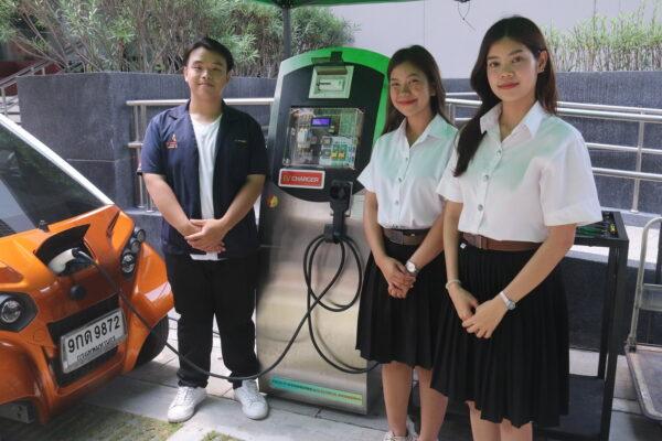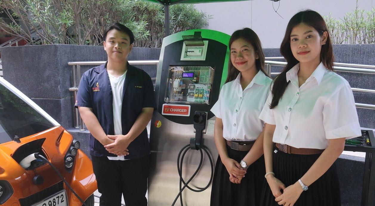 หนึ่งในก้าวเล็กๆ ของแนวทางนี้ก็คือ ตู้ EV Charger ผลงานของ 3 นักศึกษาปริญญาตรี คณะวิศวกรรมศาสตร์ มหาวิทยาลัยเทคโนโลยีพระจอมเกล้าธนบุรี (มจธ.) ประกอบด้วย นางสาวพลอยพรรณ สุขประเสริฐ (น้องเนย), นายสิทธิเดช สุนันทโชติหิรัญ (น้องที) และนางสาวอิสระยา แก่นแก้ว (น้องแอล) ภายใต้โปรเจกต์ปี 4 ในหัวข้อ “การออกแบบและสร้างเครื่องอัดประจุแบตเตอรี่สำหรับยานยนต์ไฟฟ้า”