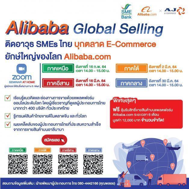 ธนาคารพัฒนาวิสาหกิจขนาดกลางและขนาดย่อมแห่งประเทศไทย( ธพว.) หรือ SME D Bank ร่วมกับ AJ E-Commerce จัดกิจกรรมสัมมนาออนไลน์ส่งเสริมลูกค้าและผู้ประกอบการเอสเอ็มอีทั่วประเทศไทยเติบโตในตลาดโลก ผ่านกิจกรรม “Alibaba Global Selling” ติดอาวุธ SMEs ไทยบุกตลาด E-Commerce ยักษ์ใหญ่ของโลกด้วย Alibaba.com เรียนรู้แนวคิดและช่องทางการขายด้วยแพลตฟอร์มออนไลน์ระดับโลก โดยผู้เชี่ยวชาญที่ดูแลผู้ประกอบการมากกว่า 400 บริษัททั่วประเทศไทย รู้เทรนด์สินค้าไทยขายดีในตลาดจีนและทั่วโลก พร้อมเผยเคล็ดลับของผู้ประกอบการไทยที่ประสบความสำเร็จจากการขายสินค้าบนอาลีบาบาและพิเศษสุดๆสำหรับผู้เข้าร่วมกิจกรรม ฟรี ลุ้นรับสิทธิ์ขายสินค้าบนแพลตฟอร์ม Alibaba.com นานถึง 6 เดือน มูลค่า 12,000 บาท (สิทธิ์มีจำนวนจำกัด)