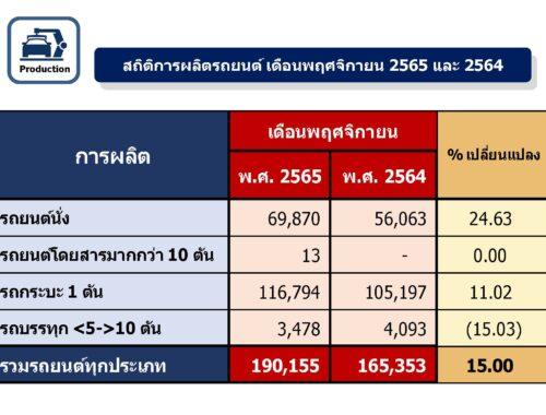เดือนพฤศจิกายน 2565 ผลิตรถยนต์ 190,155 คัน เพิ่มขึ้นร้อยละ 15 ขาย 68,284 คัน ลดลงร้อยละ 4.79 ส่งออก 87,979 คัน ลดลงร้อยละ 10.98