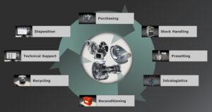 The aim is to achieve complete transparency in tool management processes through cooperation with customers. For this purpose, Walter is the central point of contact across the entire process chain, from the provision of the complete tools all the way through to recycling. This creates a cycle which guarantees optimum productivity. Unlike the methods which have been most popular until now, the Tool Management Cockpit shows not only the purchasing costs, but also the resulting production costs – i.e. the costs per produced part (CPP). This allows potential for optimisation to be identified as soon as possible. It also shows whether it is more cost- effective to optimise a machining process or to redesign it completely.