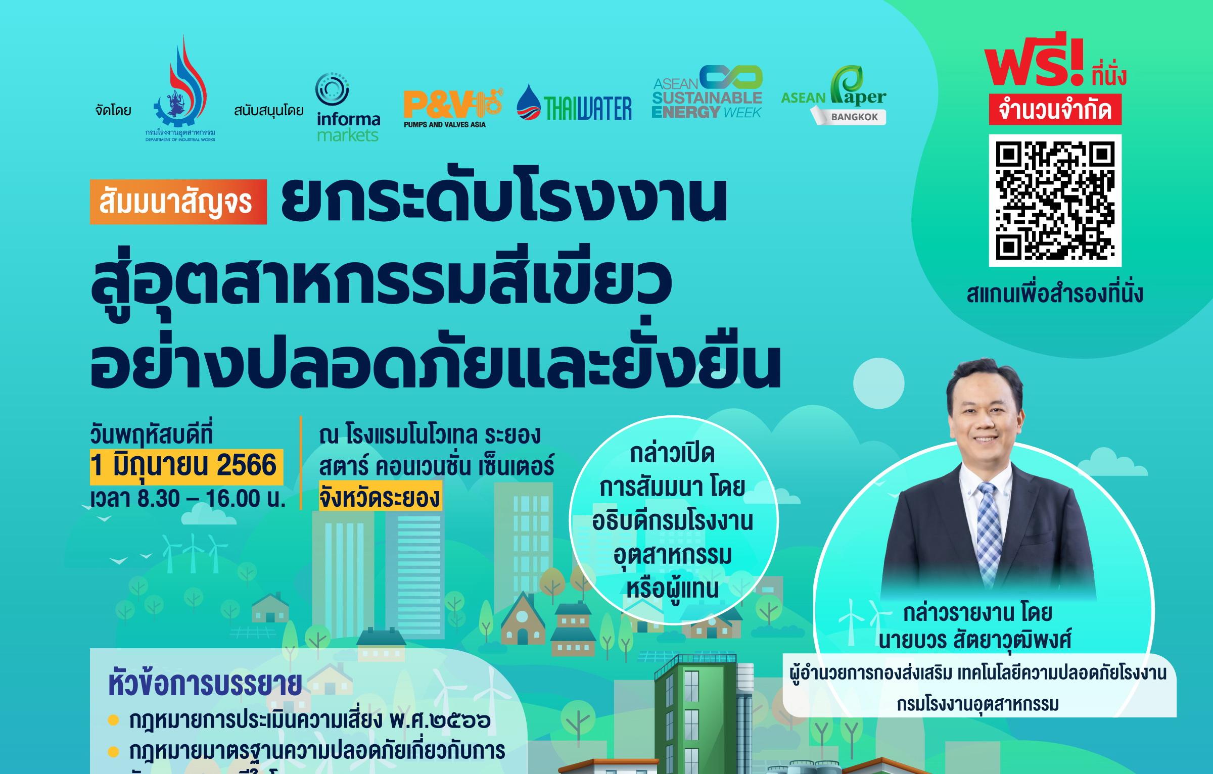 จึงขอเรียนเชิญผู้ประกอบกิจการโรงงานอุตสาหกรรม รวมทั้งผู้ที่เกี่ยวข้องในอุตสาหกรรมการผลิตต่างๆ อาทิ ฝ่ายบริหาร, ผู้จัดการโรงงาน, ผู้จัดการโครงการ, หัวหน้า ฝ่ายปฏิบัติการ,วิศวกร, ช่างซ่อมบำรุง, และอื่นๆ มาร่วมรับฟังสัมมนาความรู้จากผู้เชี่ยวชาญ ผู้ชำนาญการจากกรมโรงงานอุตสาหกรรม และองค์กรชั้นนำ พร้อมพบการสาธิตเทคโนโลยีเพื่ออุตสาหกรรม ด้าน ปั๊ม วาล์ว และอุปกรณ์ที่เกี่ยวข้องจากผู้ประกอบการชั้นนำมากมาย เพื่อนำความรู้ไปปรับใช้และต่อยอดกับธุรกิจของท่าน กับสัมมนาสัญจรภายใต้หัวข้อ “ยกระดับโรงงานสู่อุตสาหกรรมสีเขียวอย่างปลอดภัยและยั่งยืน” โดยได้รับเกียรติจาก นายจุลพงษ์ ทวีศรี อธิบดีกรมโรงงานอุตสาหกรรม** เป็นประธานและร่วมกล่าวเปิดงานสัมมนา