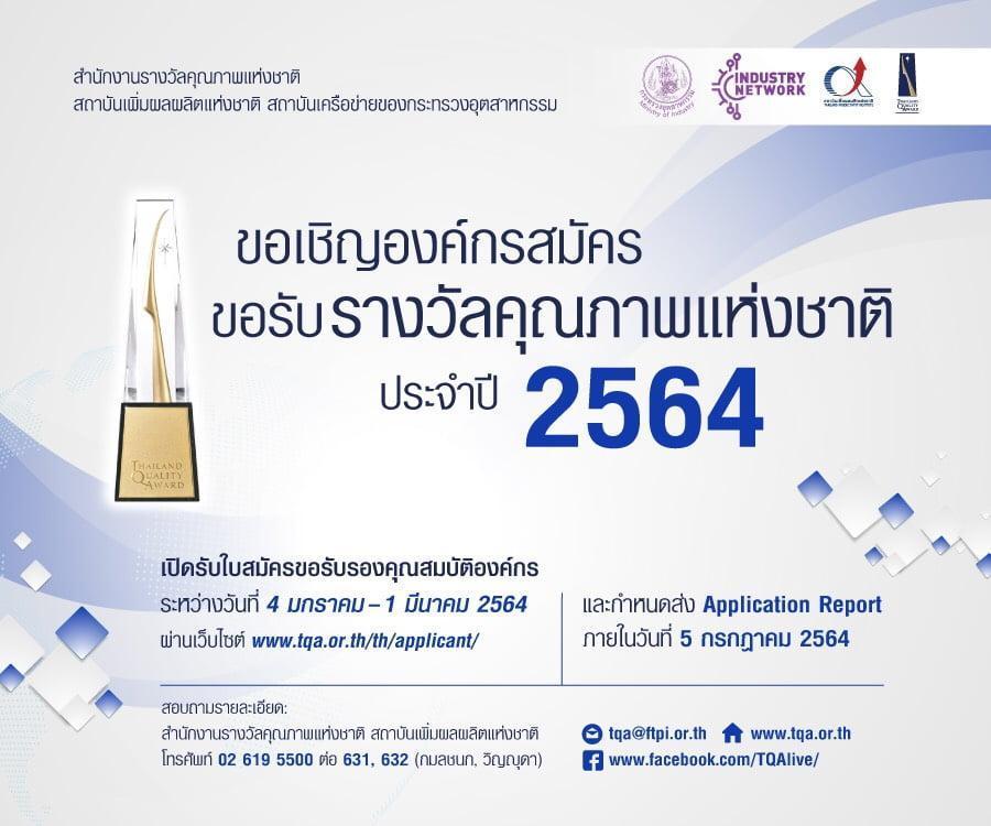 สถาบันเพิ่มผลผลิตแห่งชาติ สถาบันเครือข่ายของกระทรวงอุตสาหกรรม ในฐานะของสำนักงานรางวัลคุณภาพแห่งชาติ ขอเชิญองค์กรที่สนใจเข้าร่วมสมัครขอรับ “รางวัลคุณภาพแห่งชาติ ประจำปี 2564” รางวัลอันทรงเกียรติที่แสดงถึงความสามารถในการบริหารจัดการขององค์กรที่เป็นเลิศ และเปี่ยมด้วยศักยภาพทัดเทียมมาตรฐานโลก สร้างความภาคภูมิใจในการเป็นองค์กรคุณภาพ ทั้งนี้ องค์กรที่ได้รับรางวัลยังได้ร่วมเป็นผู้นำในการส่งเสริม แบ่งปันวิธีปฏิบัติที่จะนำไปสู่ความสำเร็จแก่องค์กรอื่น ๆ และพร้อมยืนหยัดเป็นกำลังสำคัญเพื่อขับเคลื่อนขีดความสามารถในการแข่งขันของประเทศต่อไปในอนาคต