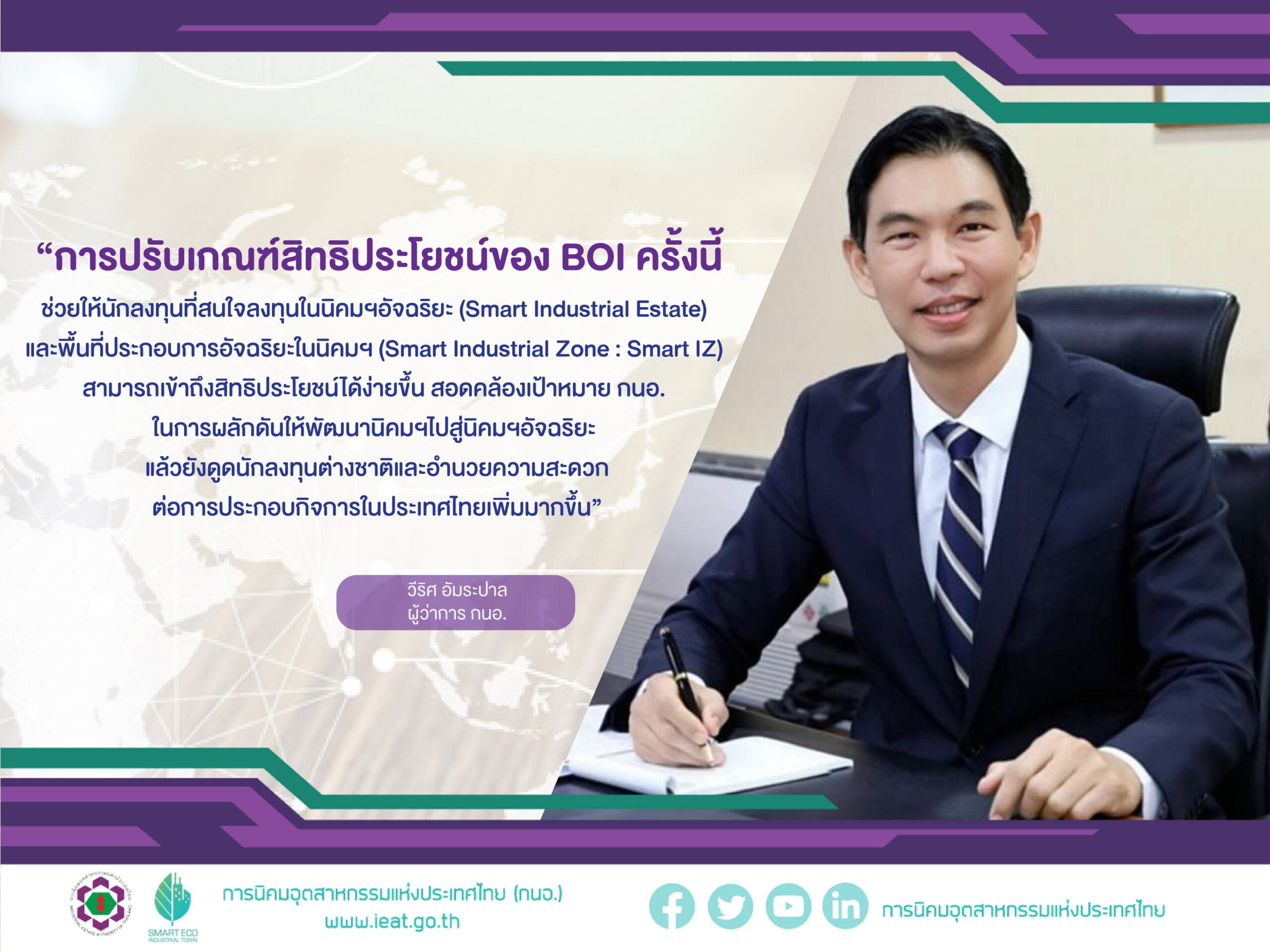 “การปรับปรุงหลักเกณฑ์สิทธิประโยชน์ในครั้งนี้ จะช่วยให้นักลงทุนที่สนใจลงทุนในพื้นที่นิคมอุตสาหกรรมอัจฉริยะ (Smart Industrial Estate : Smart IE) และพื้นที่ประกอบการอัจฉริยะในนิคมอุตสาหกรรม (Smart Industrial Zone : Smart IZ) สามารถเข้าถึงสิทธิประโยชน์ของบีโอไอได้ง่ายขึ้น ซึ่งนอกจากจะสอดคล้องกับเป้าหมายของ กนอ.ในการผลักดันให้มีการพัฒนานิคมอุตสาหกรรมไปสู่นิคมอุตสาหกรรมอัจฉริยะแล้ว ยังเป็นการดึงดูดนักลงทุนต่างชาติ และอำนวยความสะดวกต่อการประกอบกิจการในประเทศไทยเพิ่มมากขึ้น ทั้งนี้ การเจรจาให้สิทธิประโยชน์แก่นักลงทุนแต่ละรายจะมุ่งเน้นกลุ่มนักลงทุนที่มีศักยภาพ ใช้เทคโนโลยีและนวัตกรรมขั้นสูง ประหยัดพลังงาน เป็นมิตรต่อสิ่งแวดล้อม และมีความสำคัญต่อห่วงโซ่อุปทานของอุตสาหกรรมเป้าหมาย” นายวีริศ กล่าวทิ้งท้าย
