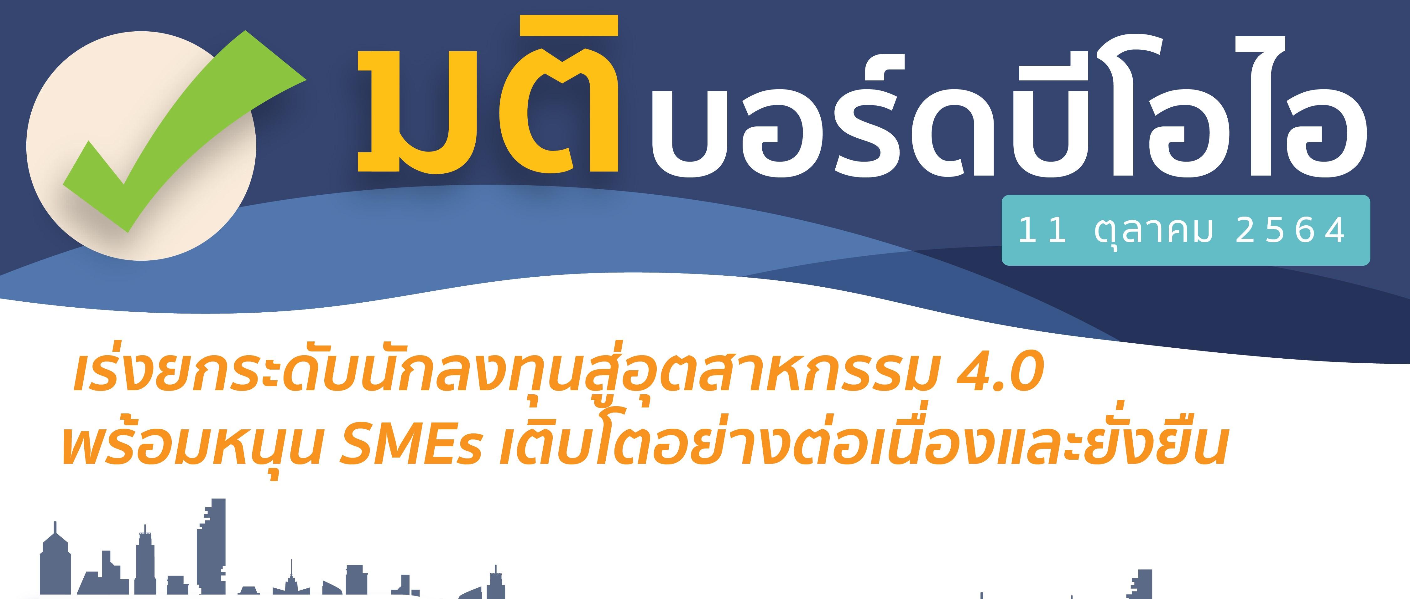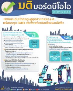 บอร์ดบีโอไออนุมัติมาตรการสนับสนุนการยกระดับอุตสาหกรรมและบริการให้เป็นระบบอัจฉริยะ และก้าวไปสู่ Industry 4.0 อย่างเต็มรูปแบบ พร้อมขยายระยะเวลามาตรการหนุน SMEs เพื่อเร่งสร้างศักยภาพและความเข้มแข็งให้สามารถเติบโตได้อย่างต่อเนื่องและยั่งยืน