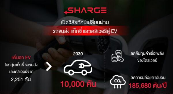 “รถยนต์ทั่วไปปล่อยคาร์บอนเฉลี่ย 211 กรัมคาร์บอน ต่อระยะทาง 1 กิโลเมตร หากธุรกิจขนส่งและโลจิสติกส์ในไทยเปลี่ยนมาใช้ EV จะช่วยลดการปล่อยคาร์บอนได้มหาศาล ในฐานะผู้นำอันดับ 1 ที่ให้บริการด้านการชาร์จรถยนต์ไฟฟ้าแบบครบวงจร SHARGE จึงมุ่งมั่นที่จะส่งเสริมให้ไดรเวอร์ที่ให้บริการรับส่งผู้โดยสาร แท็กซี่ ขนส่งพัสดุ และ Delivery ทั่วประเทศ เปลี่ยนผ่านสู่การใช้ EV เพิ่มขึ้น 10,000 คัน ภายในปี ค.ศ. 2030 (พ.ศ. 2573) ผ่านการจับมือกับเครือข่ายพันธมิตร Green Logistics หลายราย เพื่อช่วยให้ประเทศไทยเปลี่ยนผ่านสู่การใช้ EV ได้อย่างมีประสิทธิภาพและยั่งยืน โดยคาดว่าจะช่วยลดปริมาณคาร์บอนได้ 185,680 ตันต่อปี ยิ่งกว่านั้น ยังช่วยลดค่าต้นทุนเชื้อเพลิงได้เฉลี่ย 175 บาทต่อระยะทาง 100 กิโลเมตร ซึ่งจะช่วยแบ่งเบาภาระค่าใช้จ่ายของไดรเวอร์ด้วย” นายพีระภัทร กล่าว