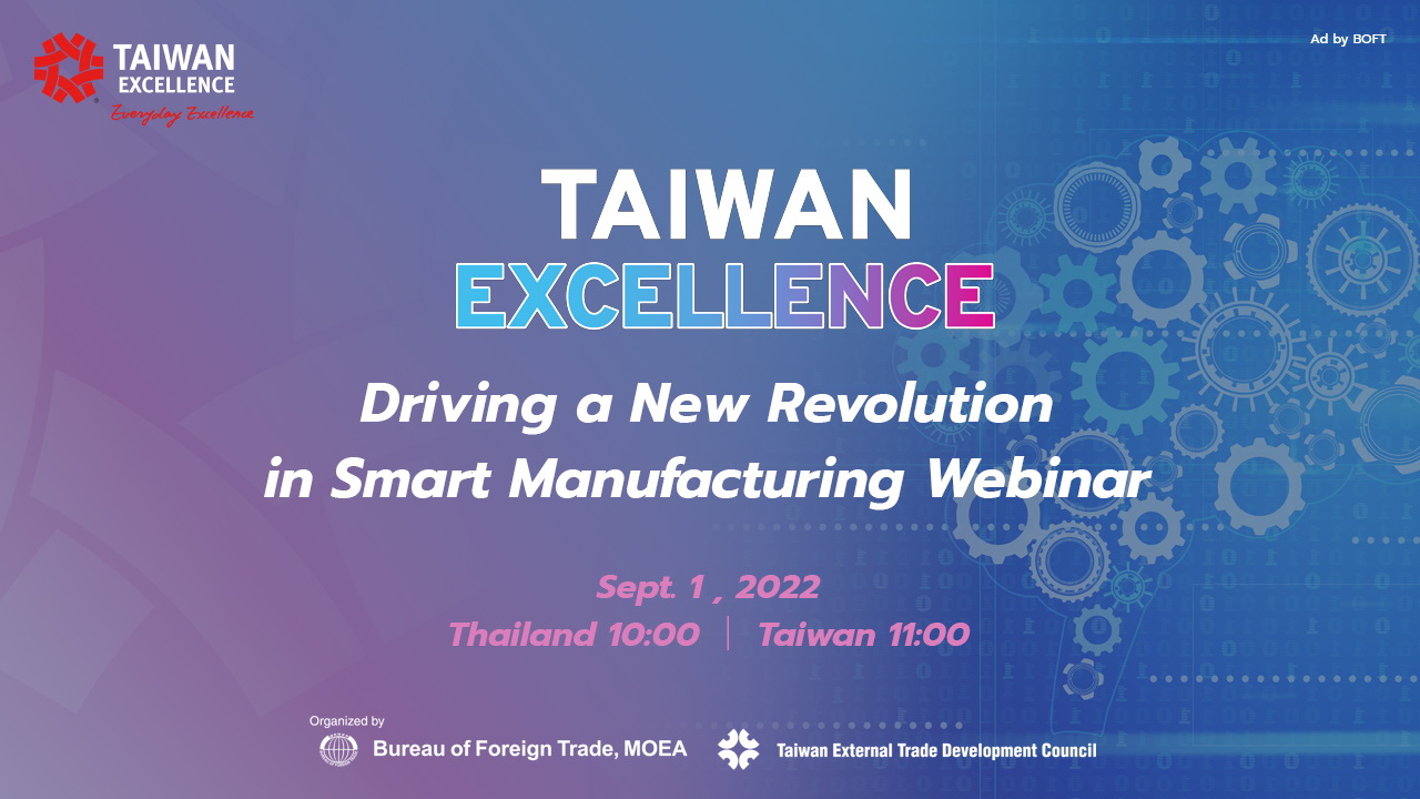 สัมมนาออนไลน์ “Taiwan Excellence Driving a New Revolution in Smart Manufacturing Webinar” พร้อมเชิญชวนนักอุตสาหกรรมการผลิตไทยเข้าชมงาน “Taiwan Expo in Thailand 2022” ระหว่างวันที่ 31 สิงหาคม 2565 ถึงวันที่ 2 กันยายน 2565 ในรูปแบบออนไลน์ 360 องศา