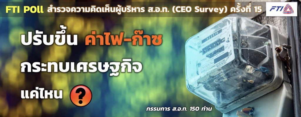 นายวิรัตน์ เอื้อนฤมิต รองประธานสภาอุตสาหกรรมแห่งประเทศไทย (ส.อ.ท.) เปิดเผยผลการสำรวจ FTI Poll ครั้งที่ 15 ในเดือนมีนาคม 2565 ภายใต้หัวข้อ “ปรับขึ้นค่าไฟ-ก๊าซ กระทบเศรษฐกิจแค่ไหน” พบว่า ผู้บริหาร ส.อ.ท. มองว่า กรณีภาครัฐจะมีการพิจารณาปรับอัตราค่าไฟฟ้าและราคาก๊าซฯ ขึ้นต่อเนื่องนั้น จะส่งผลกระทบอย่างมากต่อการฟื้นตัวของเศรษฐกิจไทย และยังเป็นการซ้ำเติมปัญหาให้แก่ผู้ประกอบการที่ต้องแบกรับภาระต้นทุนการผลิตที่อยู่ในระดับสูงในขณะนี้ จนทำให้ผู้ประกอบการมีความจำเป็นจะต้องปรับราคาสินค้าขึ้นตามต้นทุนที่เพิ่มขึ้น ซึ่งจะกระทบต่อภาระค่าครองชีพของประชาชน ดังนั้น จึงเสนอขอให้ภาครัฐพิจารณาคงอัตราค่าไฟฟ้าผันแปร (Ft) ในรอบเดือนพฤษภาคม – สิงหาคม 2565 เพื่อช่วยบรรเทาผลกระทบดังกล่าว นอกจากนี้ ผู้บริหาร ส.อ.ท. ยังได้แนะให้ภาคอุตสาหกรรมเร่งปรับปรุงกระบวนการผลิตเพื่อประหยัดพลังงาน และหันมาผลิตไฟฟ้าจากพลังงานหมุนเวียนใช้เองภายในโรงงานอุตสาหกรรม
