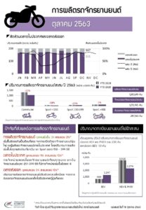 ในเดือนตุลาคม 2563 ประเทศไทยผลิตรถจักรยานยนต์จำนวน 166,636 คัน เพิ่มขึ้นร้อยละ 3 เมื่อเปรียบเทียบกับช่วงเดียวกันของปีก่อนหน้า ซึ่งเพิ่มขึ้นติดต่อกันเป็นเดือนที่ 2 โดยรถจักรยานยนต์ทุกประเภทมีปริมาณเพิ่มขึ้นเมื่อเทียบกับช่วงเวลาเดียวกันของปีก่อนหน้า จากการเปิดตัวรถจักรยานยนต์ขนาดเล็กของผู้ผลิตรถจักรยานยนต์ภายในประเทศ ยกเว้นการผลิตรถจักรยานยนต์ Sport ขนาด 150-399 ซีซี เท่านั้นที่ลดลงร้อยละ 39 เมื่อเปรียบเทียบกับช่วงเดียวกันของปีก่อนหน้า โดยปริมาณการจำหน่ายรถจักรยานยนต์มีจำนวน 126,323 คัน ลดลงร้อยละ 11 เมื่อเปรียบเทียบกับช่วงเดียวกันของปีก่อนหน้า เป็นผลจากการลดลงของการจำหน่ายรถจักรยานยนต์ทุกขนาด ยกเว้นจักรยานยนต์ขนาด 251-399 ซีซี ที่มีการจำหน่ายเพิ่มขึ้นร้อยละ 8 เมื่อเปรียบเทียบกับช่วงเดียวกันของปีก่อนหน้า ในส่วนของการจดทะเบียนใหม่ของรถ xEV มีปริมาณ 361 คัน ลดลงร้อยละ 18 เมื่อเปรียบเทียบกับช่วงเดียวกันของปีก่อนหน้า เป็นผลจากการจดทะเบียนใหม่ของรถ HEV จำนวน 230 คัน ลดลงร้อยละ 36 เมื่อเปรียบเทียบกับช่วงเดียวกันของปีก่อน ในขณะที่รถ BEV มีจำนวน 82 คัน เพิ่มขึ้นร้อยละ 60 เมื่อเปรียบเทียบกับช่วงเดียวกันของปีก่อนหน้า