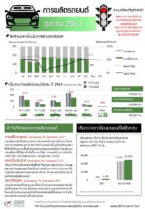 ในเดือนตุลาคม 2563 ประเทศไทยผลิตรถยนต์จำนวน 149,360 คัน โดยเป็นการผลิตรถยนต์มากกว่าหนึ่งแสนคันติดต่อกันเป็นเดือนที่ 3 นับตั้งแต่การแพร่ระบาดของโควิด-19 แต่ปริมาณการผลิตยังคงลดลงร้อยละ 2 เมื่อเปรียบเทียบกับช่วงเดียวกันของปีก่อนหน้า ซึ่งเป็นผลจากตลาดส่งออกเป็นสำคัญ หากพิจารณารายผลิตภัณฑ์พบว่า ปริมาณการผลิตรถยนต์ลดลงในทุกผลิตภัณฑ์ยกเว้น รถ Single Cab มีปริมาณการผลิตเพิ่มขึ้นที่ร้อยละ 42 เมื่อเปรียบเทียบกับช่วงเดียวกันของปีก่อนหน้า และรถยนต์นั่งขนาดน้อยกว่า 1,500 ซีซี ปริมาณการผลิตเพิ่มขึ้นที่ร้อยละ 10 เมื่อเปรียบเทียบกับช่วงเดียวกันของปีก่อนหน้า