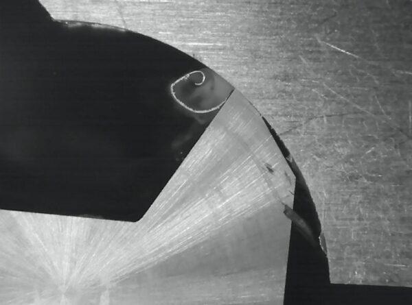 The idea of capturing the machining process, chip formation and the behavior of the metalworking fluid more precisely than ever before through photos and videos came about as part of a joint project with the renowned ETH Zurich. The research and development team at Swiss metalworking fluids experts, Blaser Swisslube, set about the planning and implementation. The use of a high-speed camera with a macro lens, which is placed behind a sight glass to keep the metalworking fluid at a distance, should make uniquely sharp, precise recordings possible. A ring light was used to provide the necessary light intensity, as well as a carbide cutter with a helix angle of 0° that was specially ground for this particular test.
