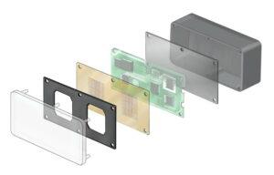 This exploded diagram is of a typical automotive radar sensor with all the components faded, except the radar-absorbing plate, which is second component from the left. (Image courtesy of SABIC) |
