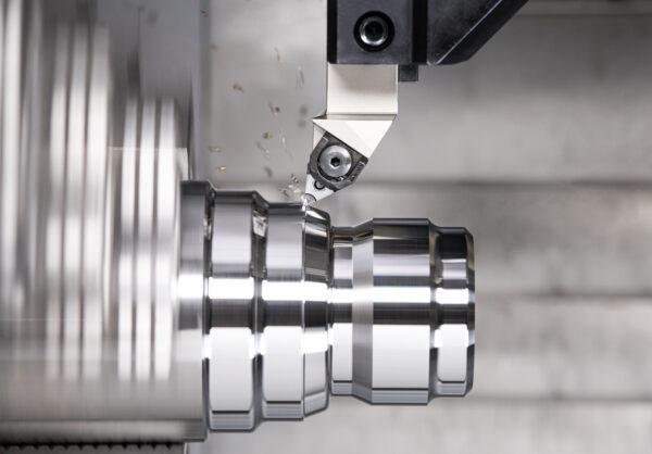 Another interesting product is LOGIQ-6-TURN (Figure.2), a newly designed triangular insert that offers a cost- effective solution for semi-finish and finish turning with a focus on achieving high surface quality. This double-sided insert features a 55° corner angle and positive rake cutting geometry, providing 6 indexable cutting edges. It presents a significant alternative to the standard ISO-type rhombic insert of DCMT type, which only offers 2 cutting edges. One key advantage is the ease with which LOGIQ-6-TURN inserts can be mounted on turning tools designed for triangular TNMG inserts.