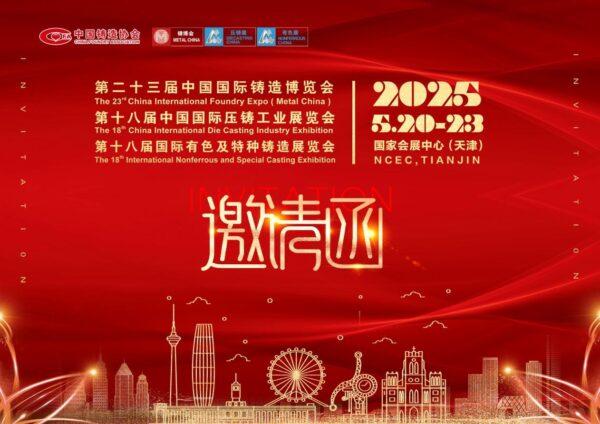 We are delighted to invite you to participate in the 23rd China International Foundry Expo, the 18th China International Diecasting Industry Exhibition, 18th International Nonferrous and Special Casting Exhibition (METAL/DIECASTING/NONFERROUS CHINA 2025), hosted by China Foundry Association from May 20-23 at the National Convention and Exhibition Center, Tianjin. This premier event will bring together industry leaders, innovators, and professionals from around the globe to showcase the latest advancements in the metalcasting industry.